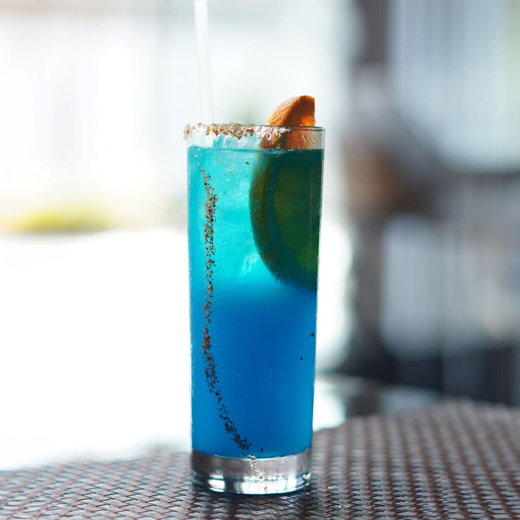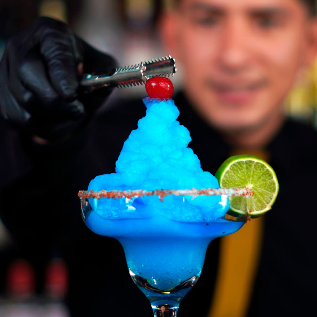 «Escarchada con sal y tajín, tequila, licor de naranja o curacao blue, solución cítrica y toque de jarabe de azucar»